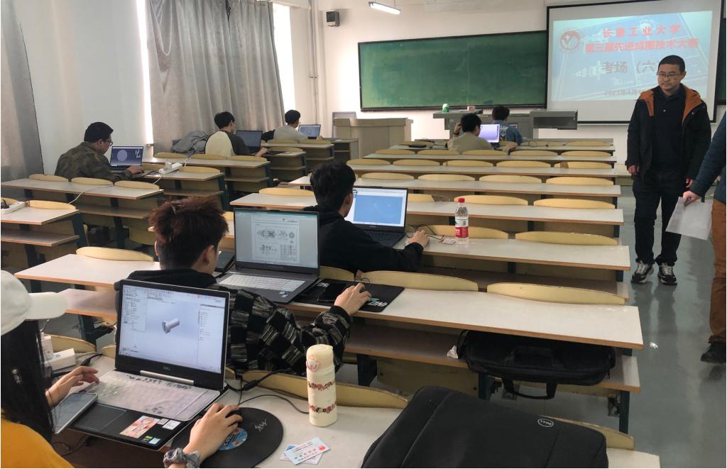此次竞赛内容包括投影基础与构型和产品信息建模两项内容。比赛过程中,同学们认真分析题目,按照国家标准与竞赛要求进行绘制与三维建模,作答有条不紊,学以致用,将工程制图知识应用于实际操作中。